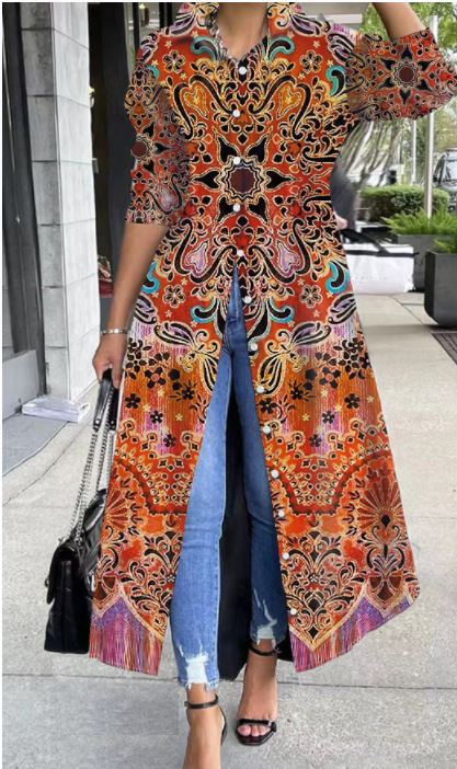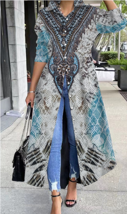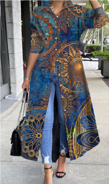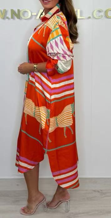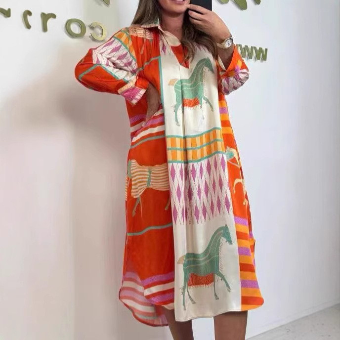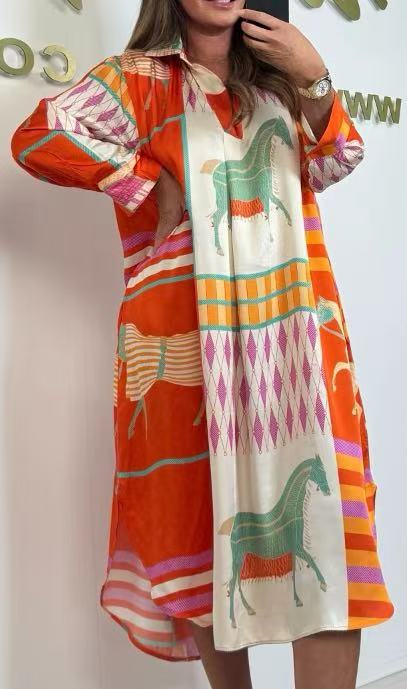 Fashionable Temperament Gradient Printing Shirt Collar Long Sleeve Dress