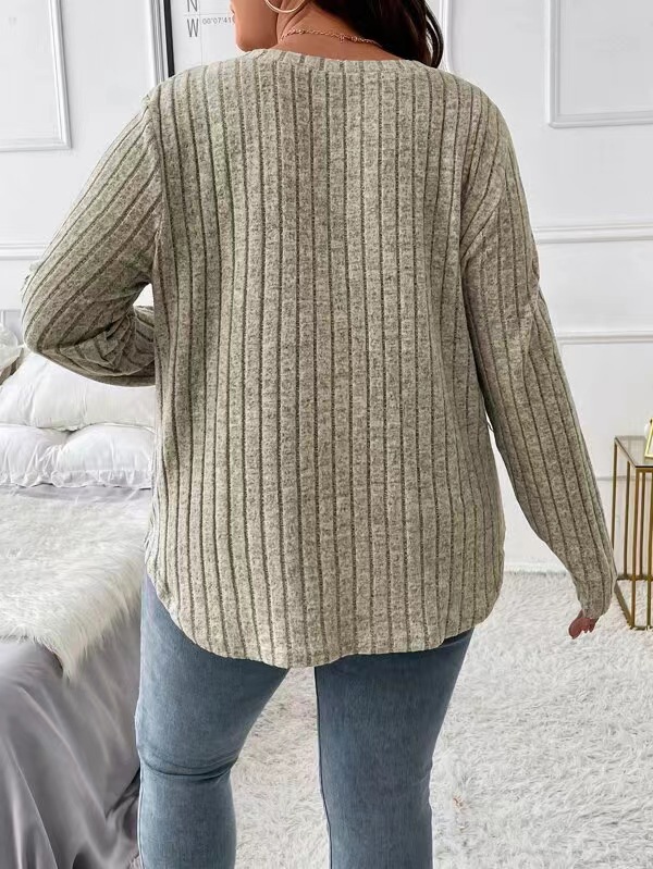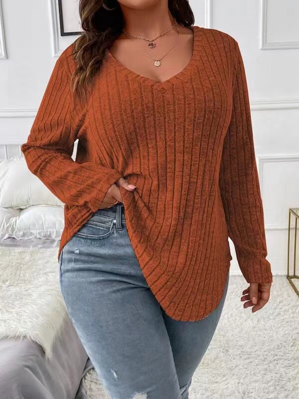 Solid Color plus Size V-neck Long-Sleeved T-shirt