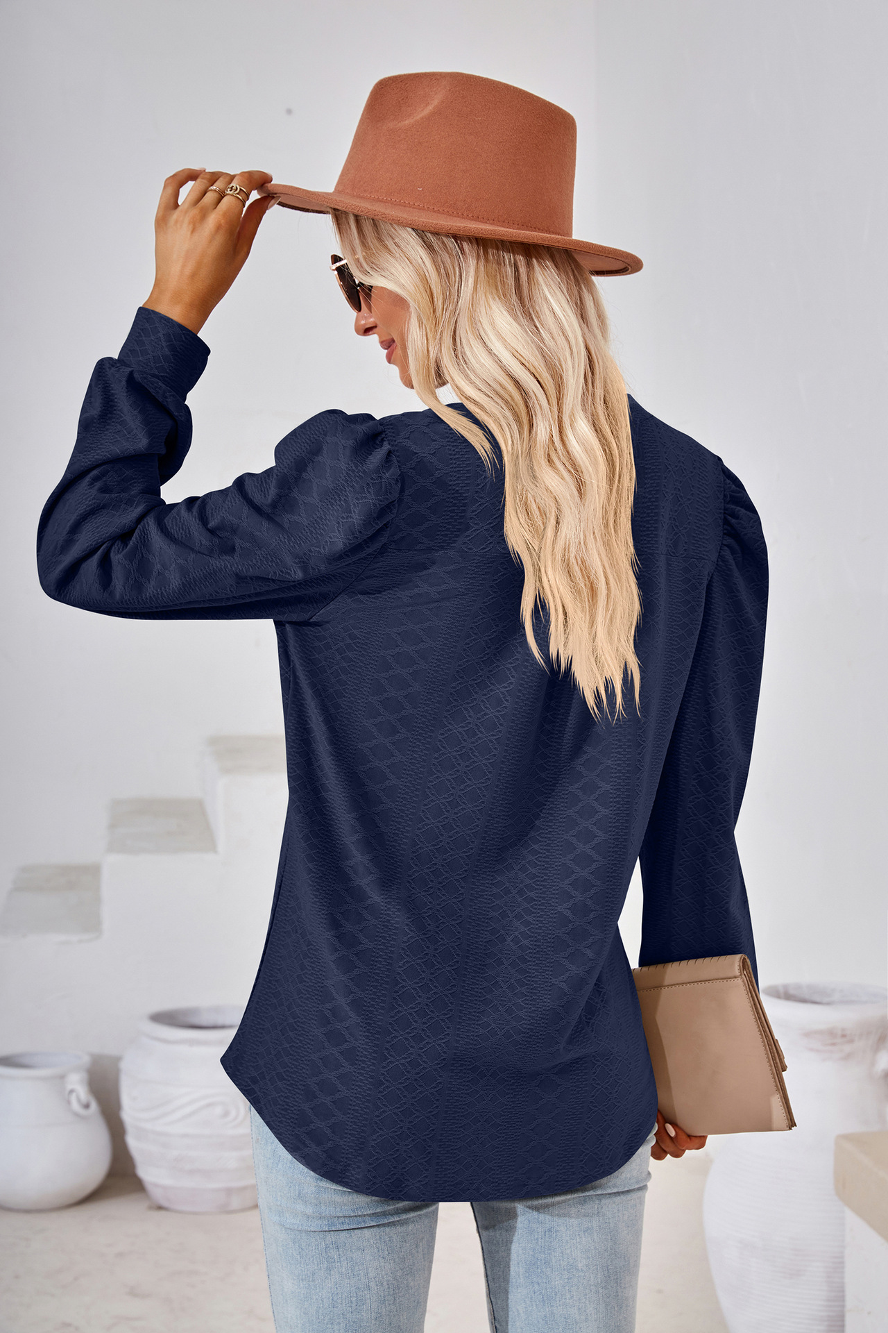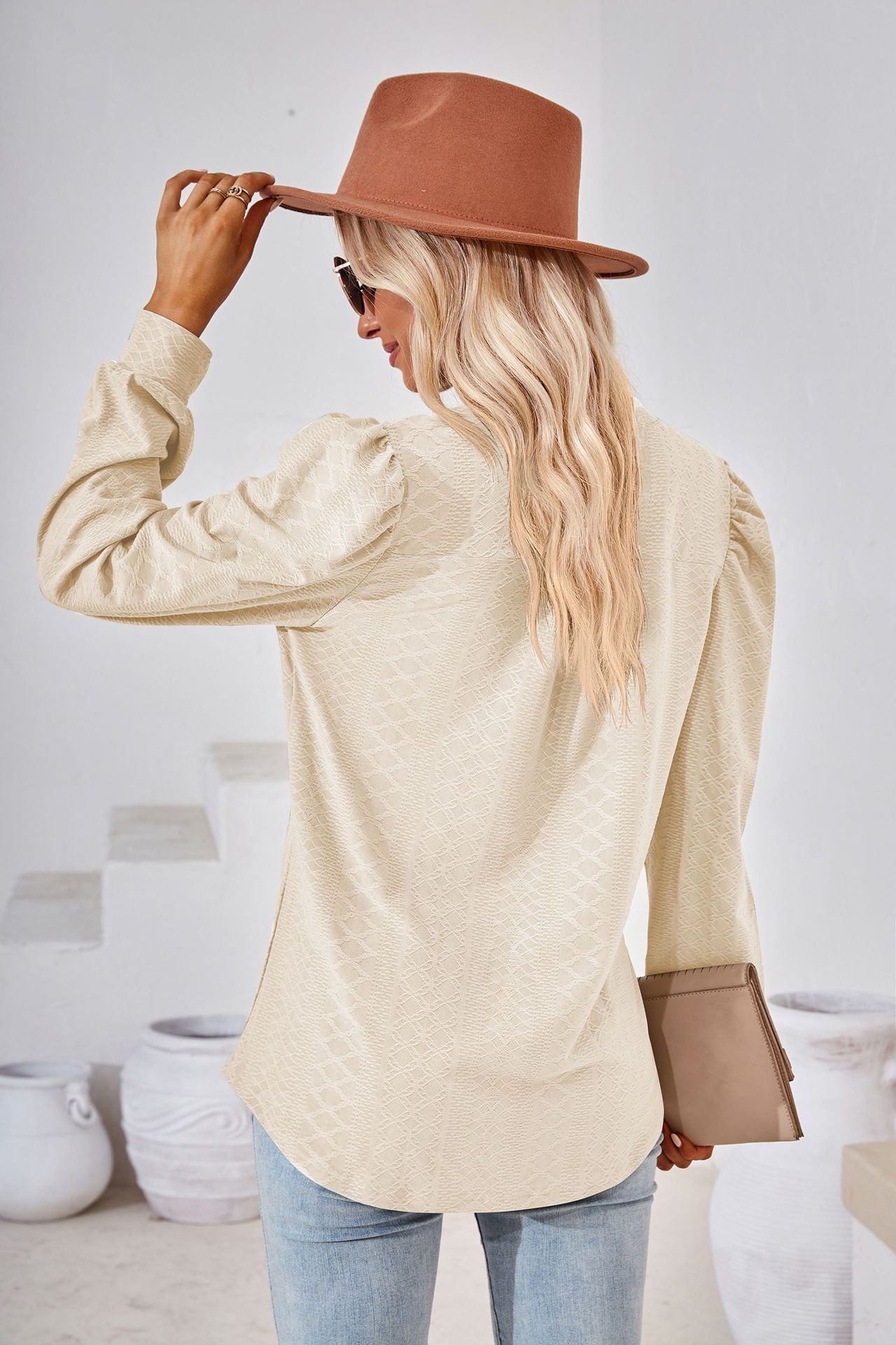 Solid Color and V-neck Jacquard Long Sleeve Loose T-shirt