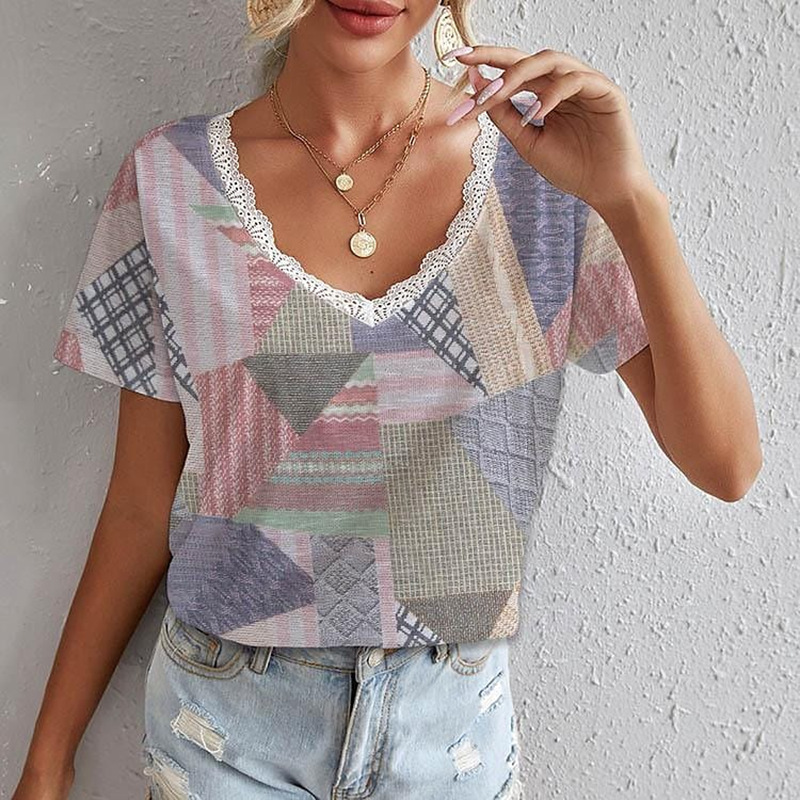 Lace V-neck Retro Geometric Printed Short-Sleeved T-shirt