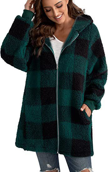 Long Sleeve Plaid Hooded Zipper with Pockets Baggy Coat